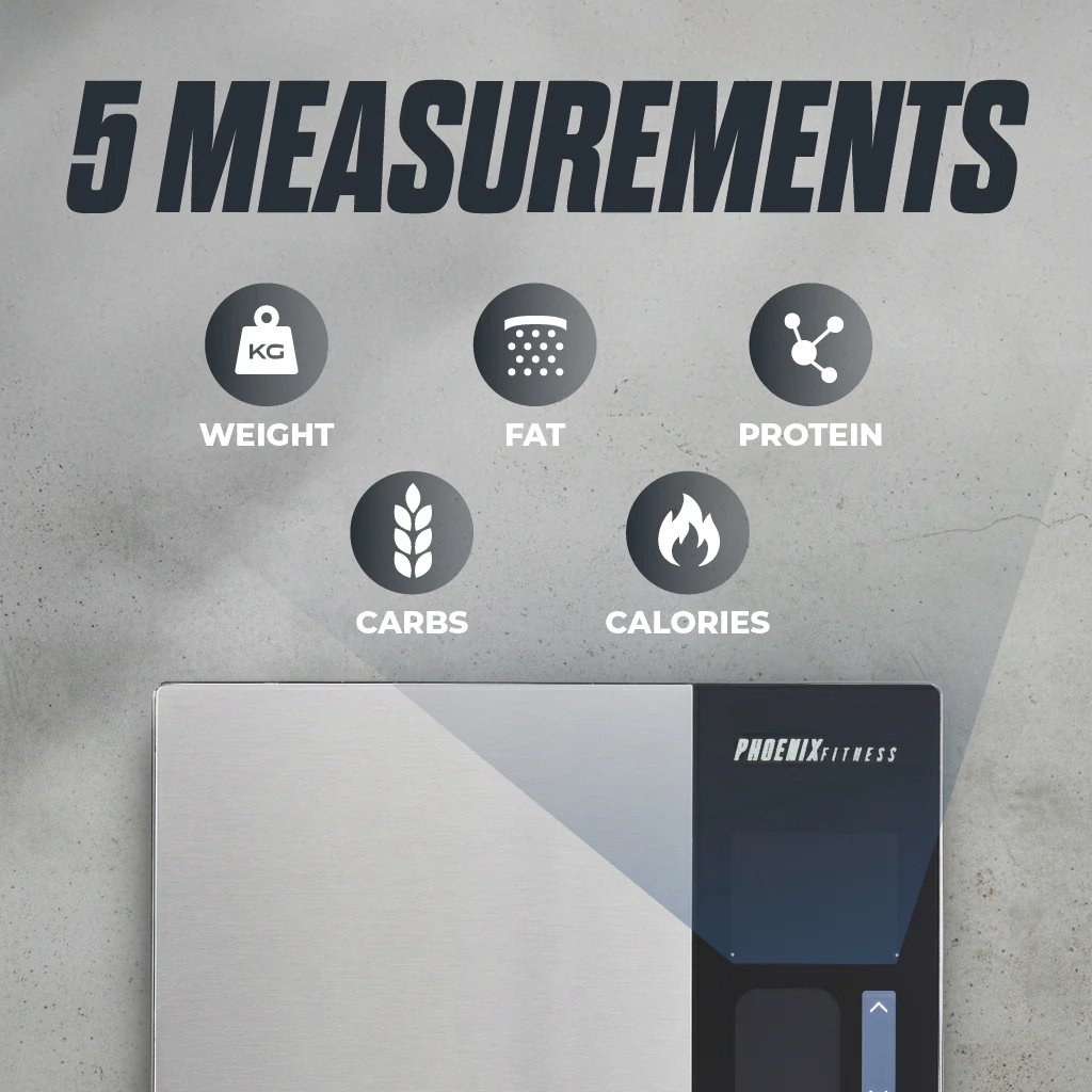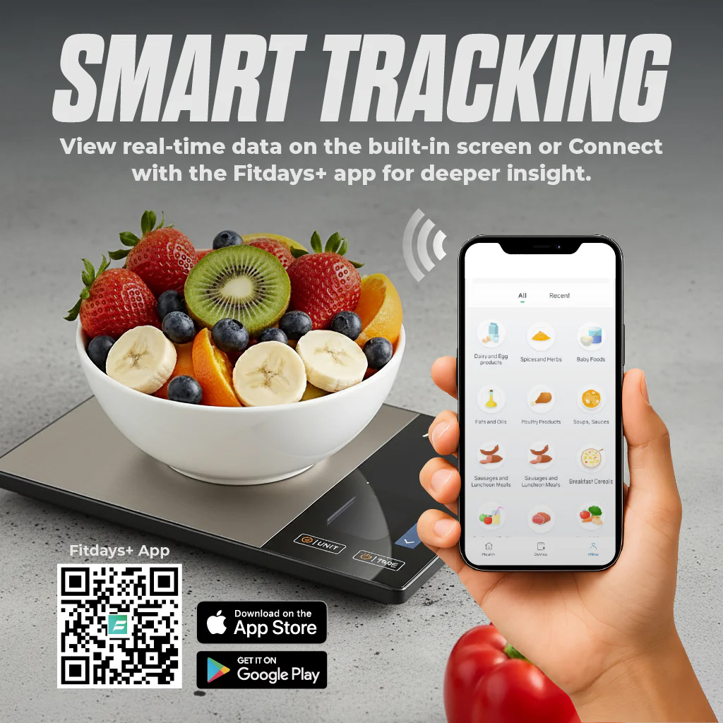 It connects via Bluetooth to the Fitdays+ mobile app, which calculates Calories, Fat, Carbs, and Protein for your food. The app syncs the measured weight and allows you to track nutrient intake and trends to help manage your diet.