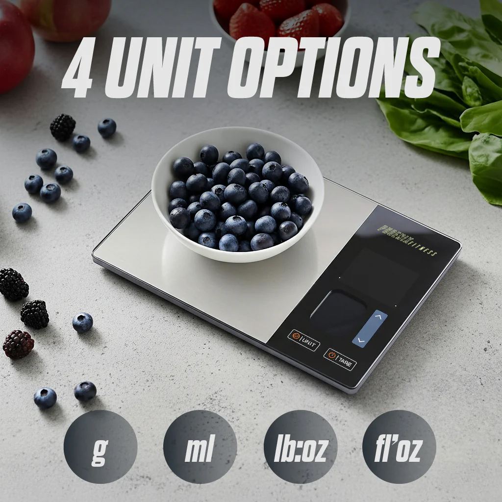 For convenient use, the scale has a clear LED display area of . It can store up to 50 of your favorite foods for quick selection using the up/down buttons on the device itself. The unit has a durable stainless steel platform, a slim profile, and anti-slip silicone pads for stability.