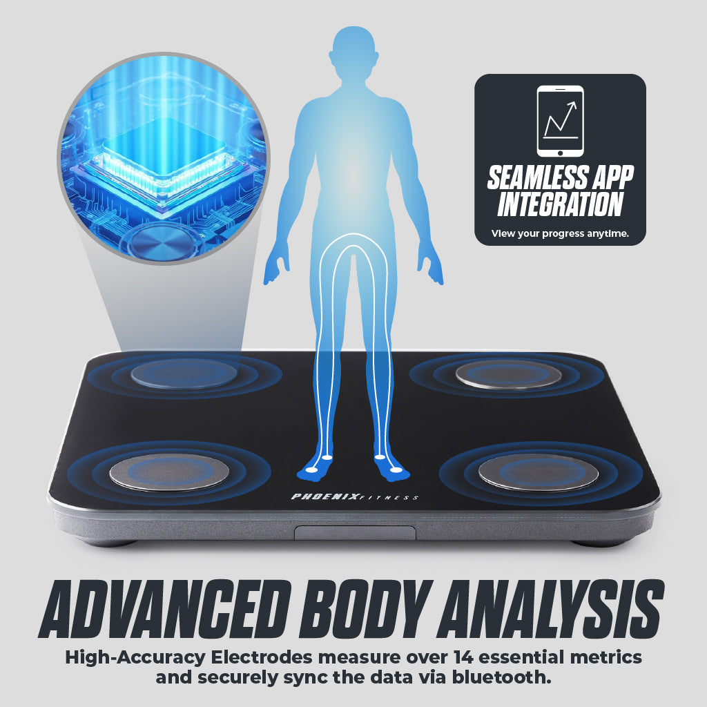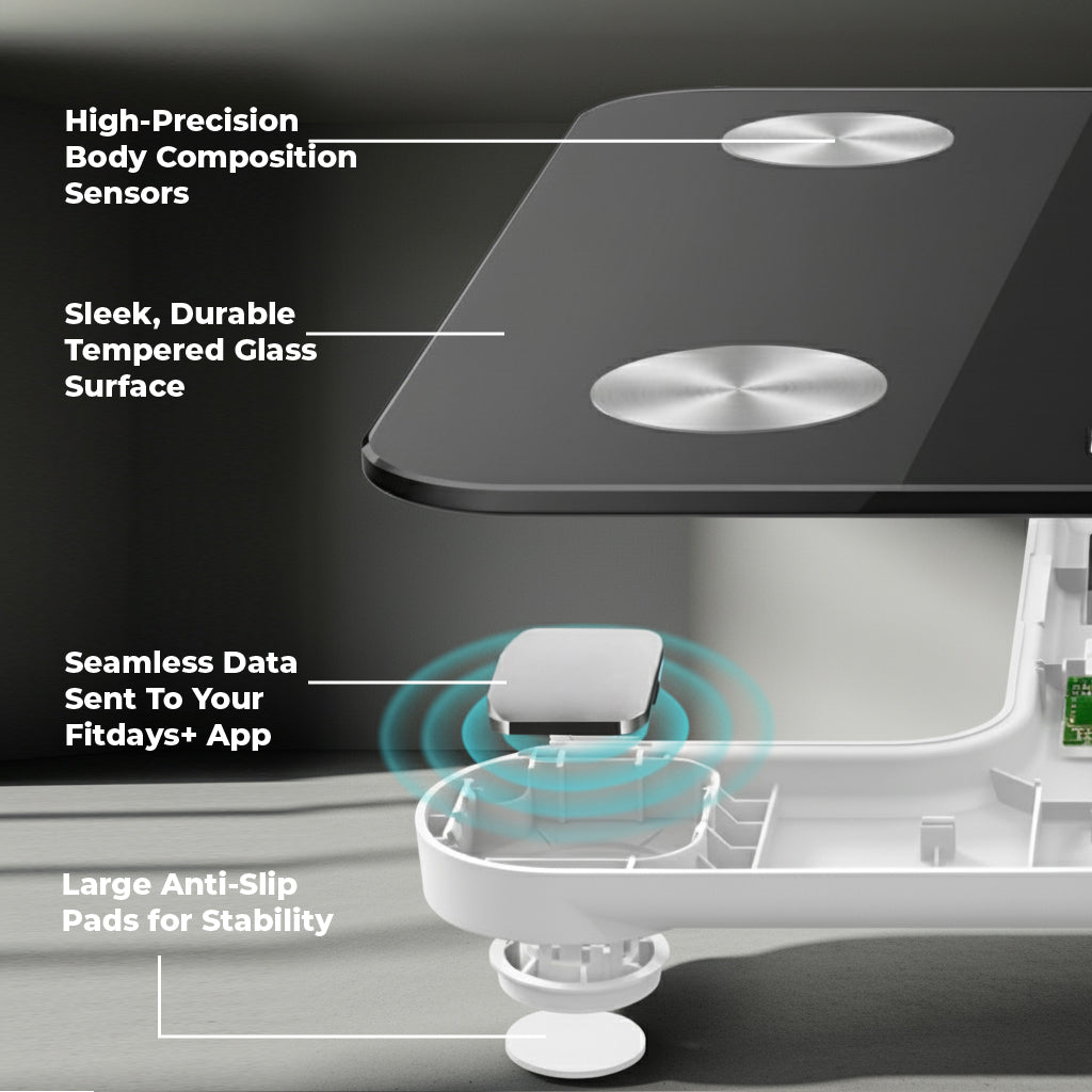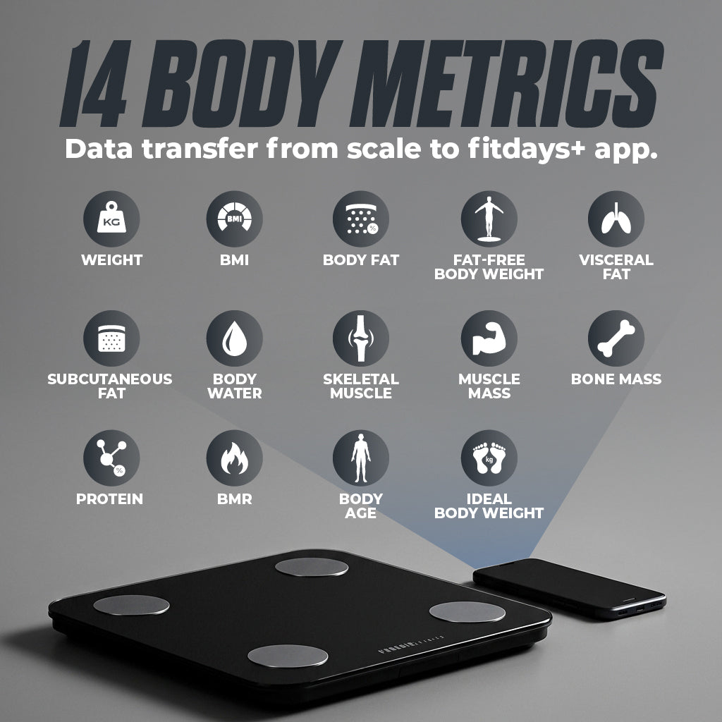 Smart Body Scale is the essential tool for tracking your health journey. It measures not just weight, but a full 14 body composition metrics, including BMI, body fat percentage, muscle mass, and BMR. The scale connects via Bluetooth to the Fitdays+ app on your smartphone or tablet, which is compatible with iOS 8.0+ and Android 6.0+.