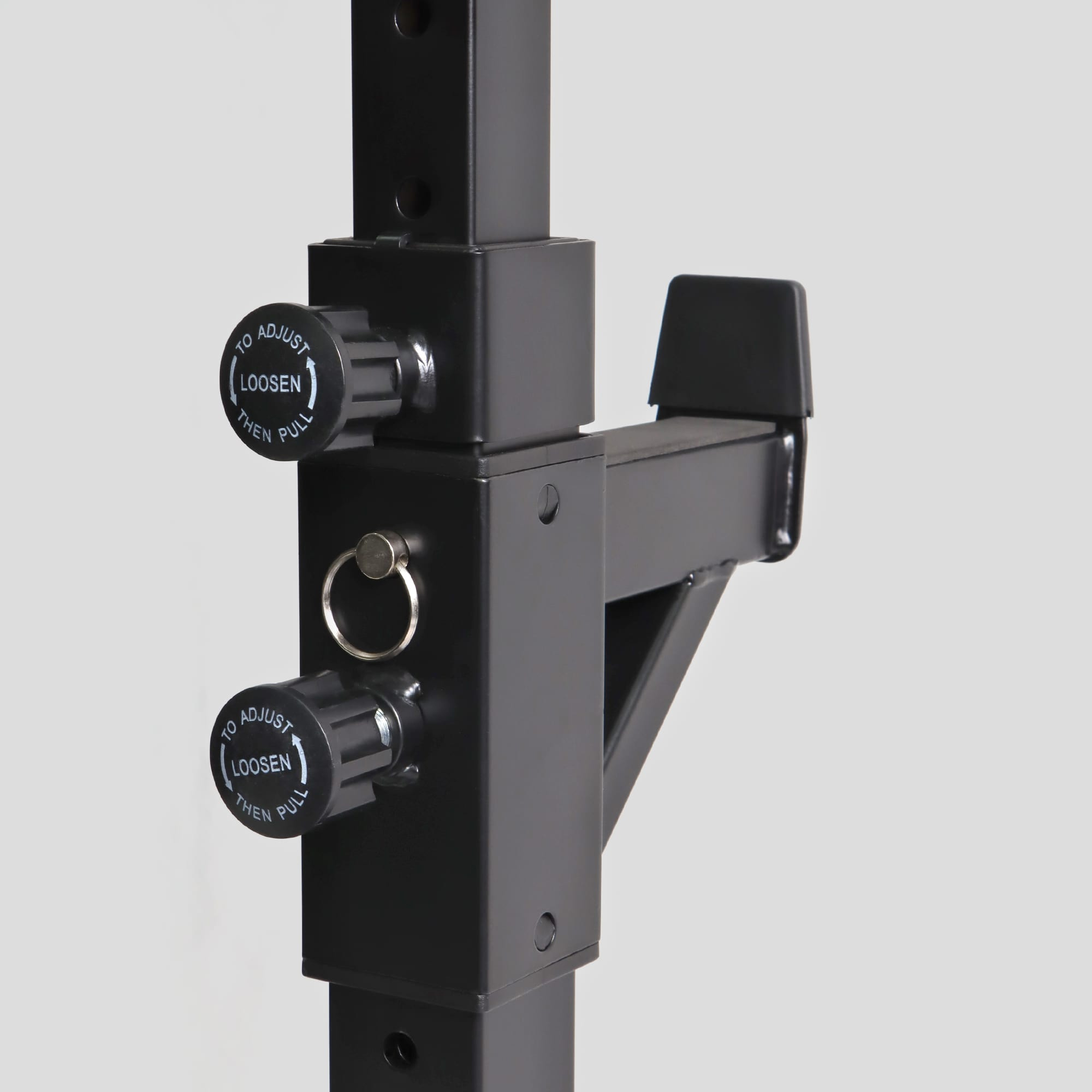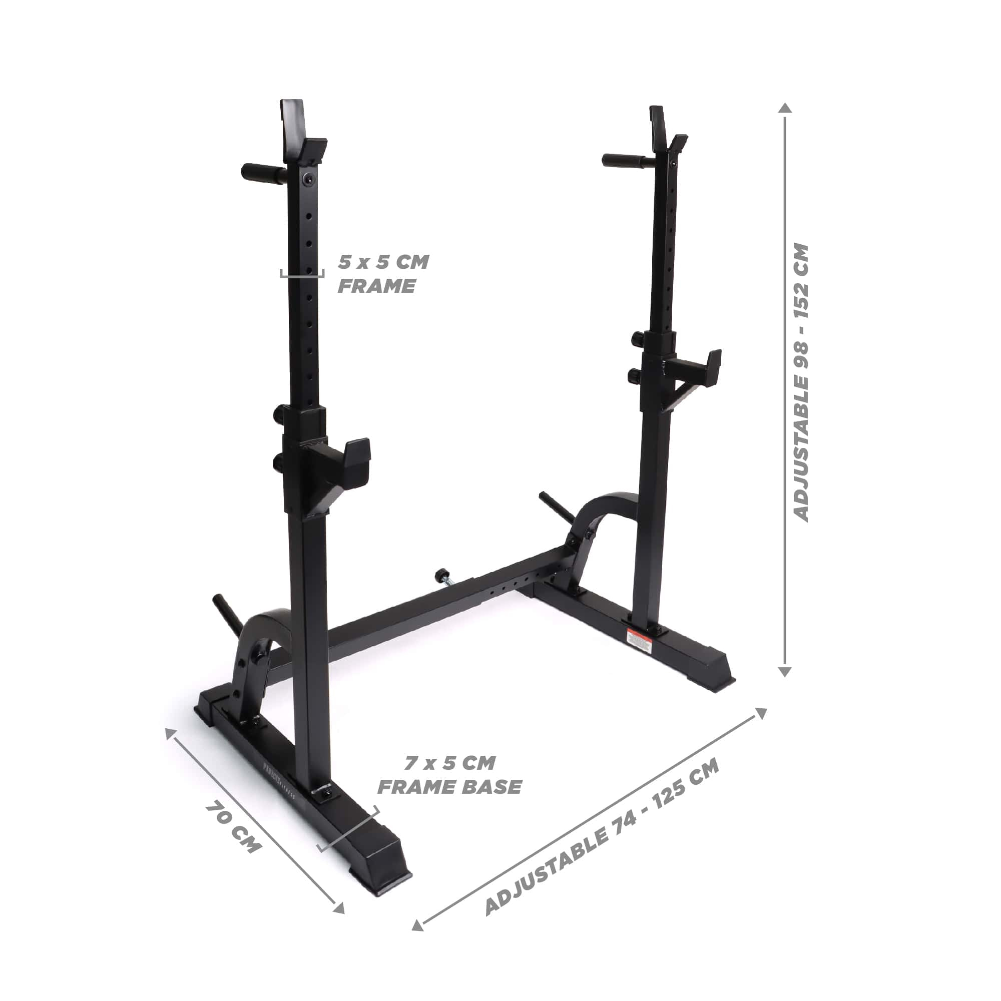 Multi-Functional: Accommodates 1” and 2” weight plates and supports dips, squats, weightlifting, and bench press. Adjustable: 13 height settings, 14 width settings, and 6 j-cup positions for a customised workout. Stable & Secure: Quadrilateral structure offers maximum safety and stability for all lifting levels. Easy Adjustment: Twist and pull mechanism with secure pins for quick and hassle-free changes. Heavy-Duty Construction: Durable alloy steel with 5x7cm base thickness and 5x5cm frame thickness; features non-slip caps to protect floors.