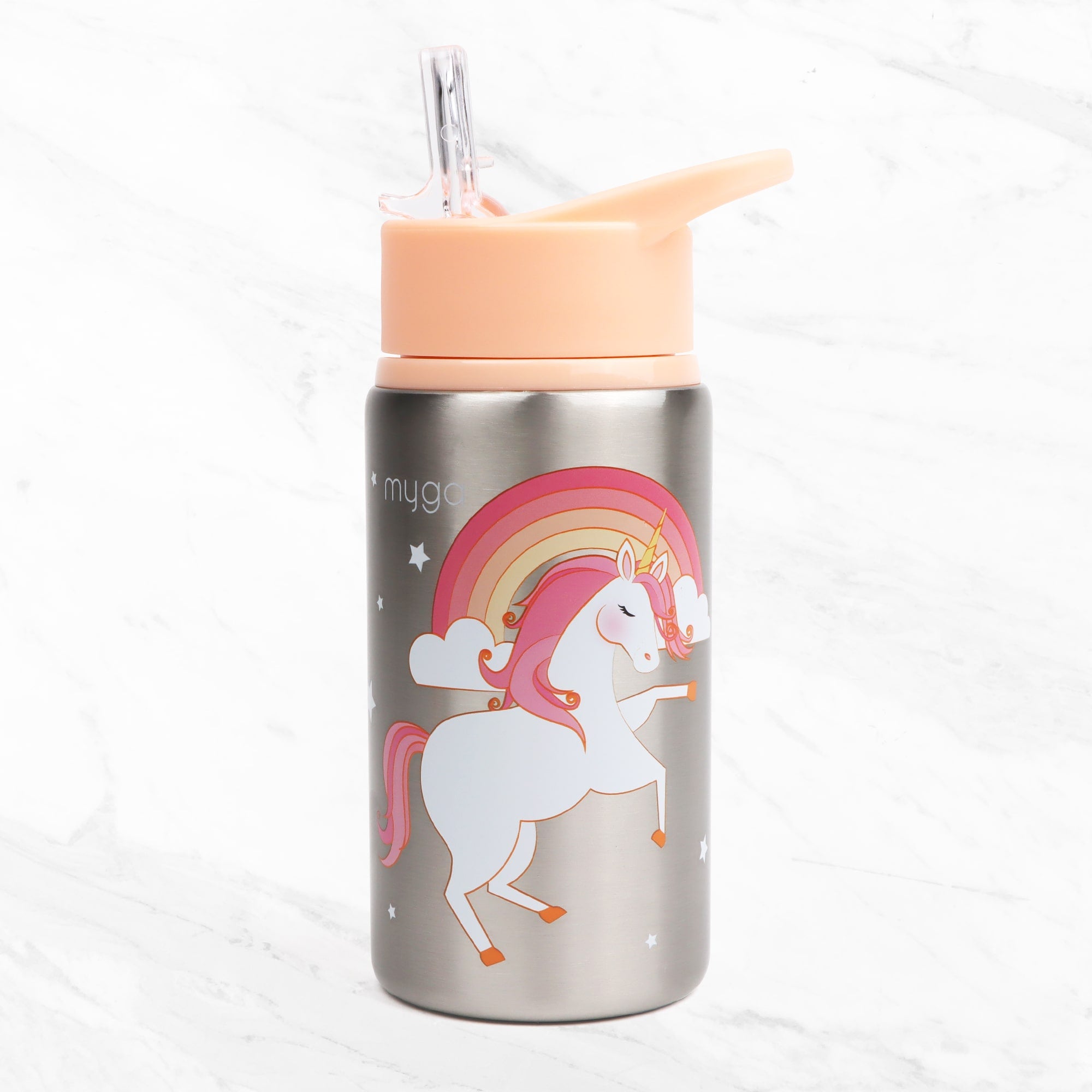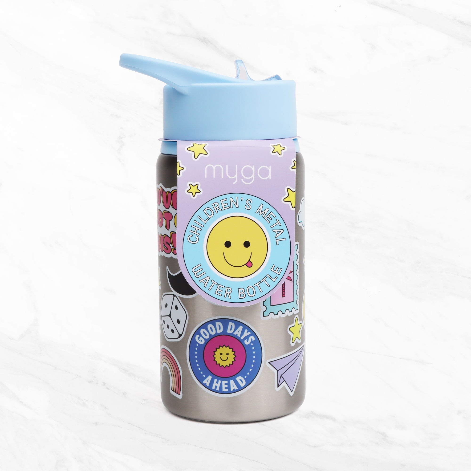 - Cute Design: Beautiful illustration that captures the imagination. - Motivational Wristbands: Includes 4 removable silicone wristbands with empowering affirmations, perfect for sharing with friends to spread positivity. - Kid-Friendly Material: Made from durable PP with a PS lid, ensuring it can handle the rough and tumble of everyday play. - Interactive: Encourages children to drink more water and teaches them about sharing and positivity through the wristbands. - Leakproof Straw Lid: The bottle includes a BPA-free retractable straw for spill prevention. Its secure lid opens to reveal the straw for sipping and folds it back inside with a light push to prevent spills and messes. - Convenient Size with Carry Handle: This lightweight bottle is easy for little hands to carry, fits in most cup holders, and has a loop handle for attaching to backpacks or strollers. - For every adventure: Perfect for school, playdates, or sports.