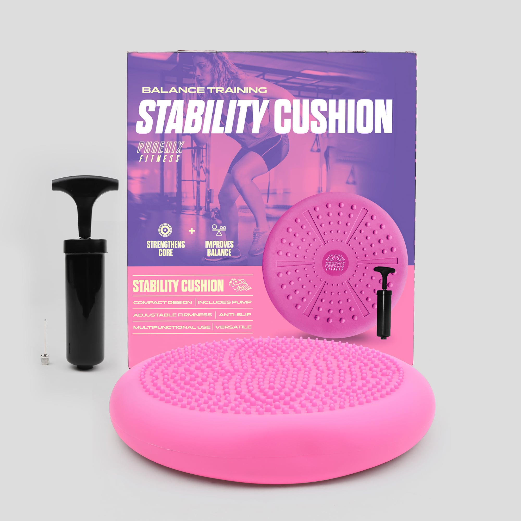 wobble cushion is a versatile exercise tool that helps improve core strength, balance, posture, and stability. Our stability cushion includes a convenient hand pump, making it easy to inflate and deflate to your preferred level of instability. Ideal for beginners and fitness enthusiasts, the adjustable difficulty allows you to customize your workout and feel your muscles engage for an effective and challenging workout.
