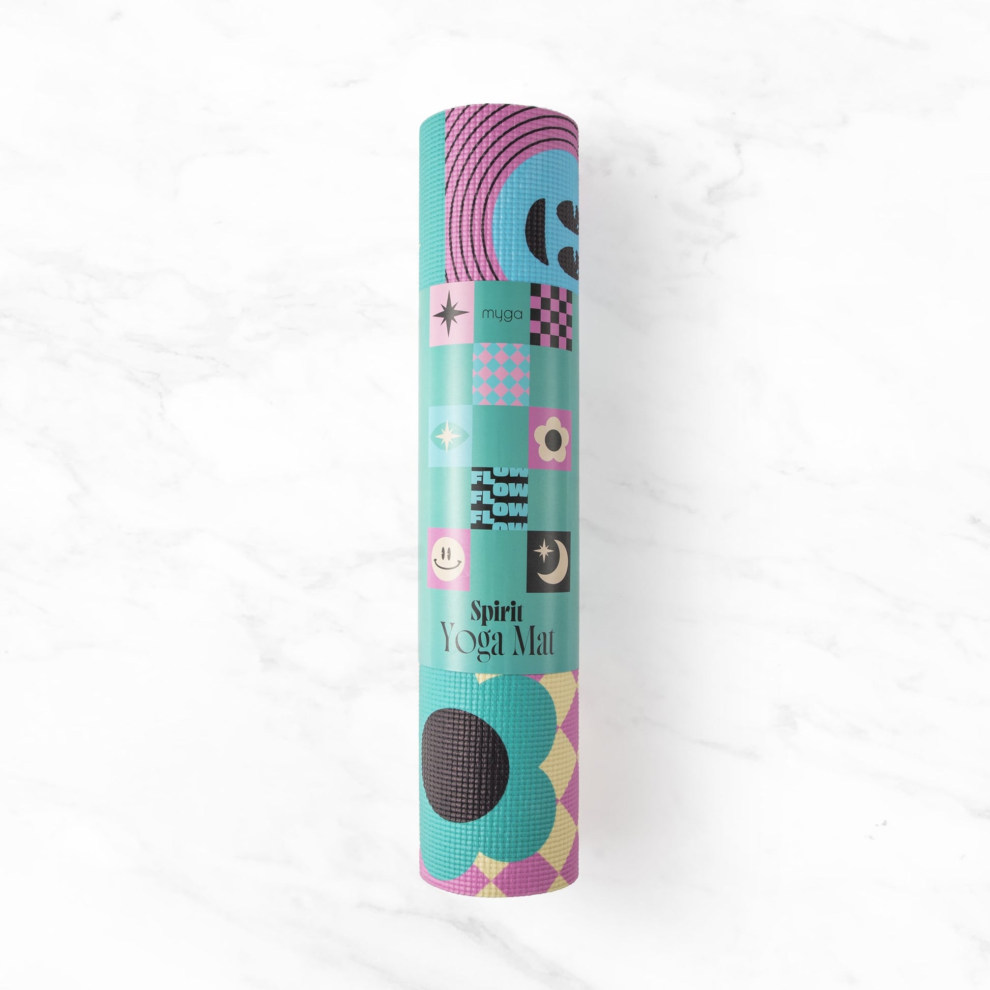 Unleash your creativity and energy with the vibrant Spirit yoga mat! This eye-catching design features bold, playful patterns alongside cheerful icons, celestial stars, and retro-inspired shapes, making every practice a visual celebration. Perfect for expressing your individuality, this mat inspires positivity and mindfulness.