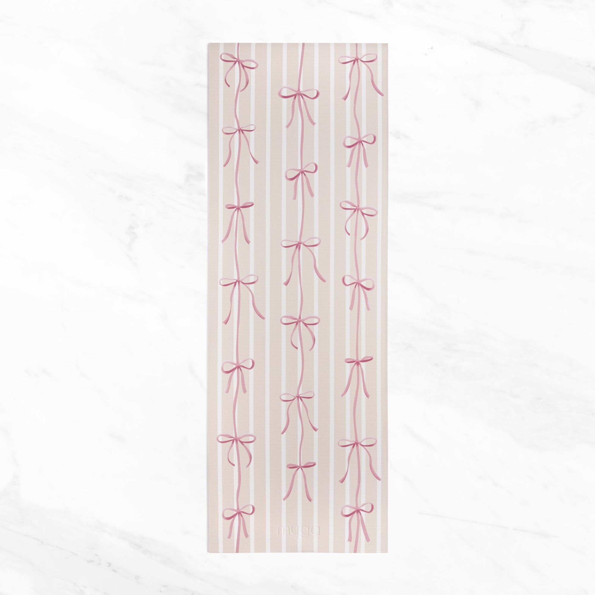 Add charm to your practice with this playful bow-patterned mat. Lightweight, portable, and quick-drying, it offers medium grip and cushioning—perfect for yoga, Pilates, or any workout.