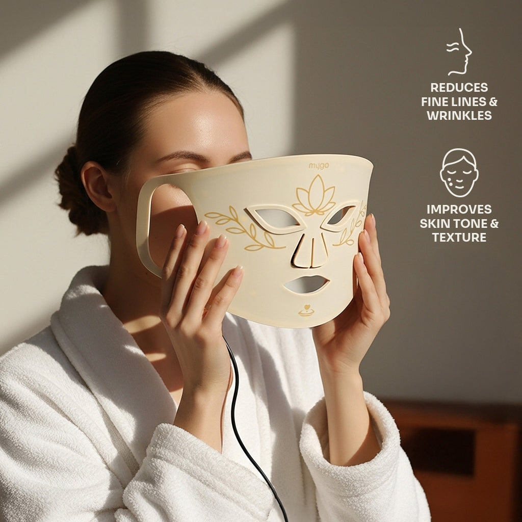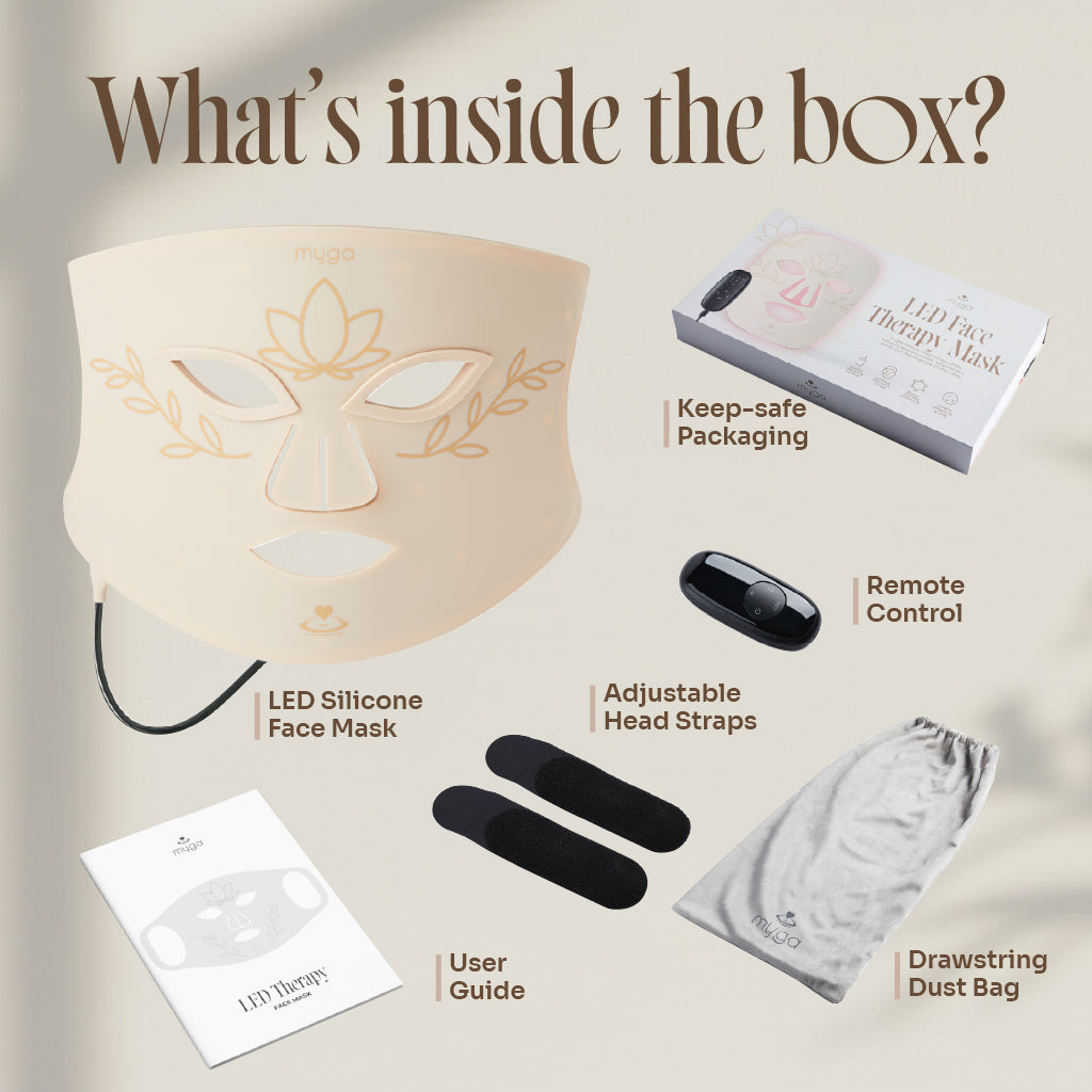 Discover a skincare ritual rooted in light. The Myga LED Face Therapy Mask uses advanced light technology and NIR (Near Infrared) to support skin clarity, calmness, and radiance, all from the comfort of home. With 100 high-performance LED beads and 7 light colour modes, this flexible, wearable mask gently enhances your complexion while you rest, meditate, or simply breathe.