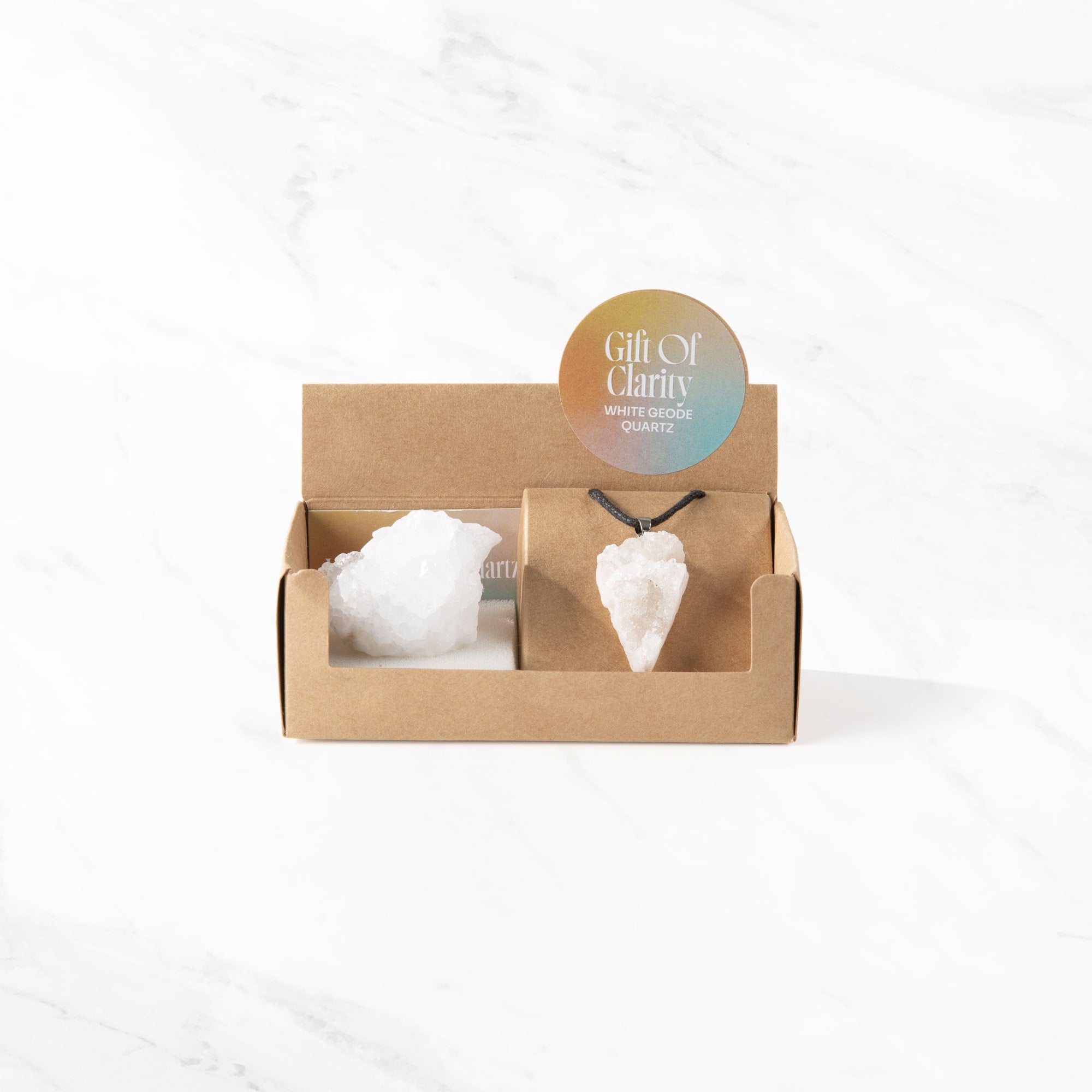 White Geode Set: Includes an arrowhead pendant and a natural stone. With its sparkling inner crystals, White Geode enhances spiritual growth, clarity, and balance.